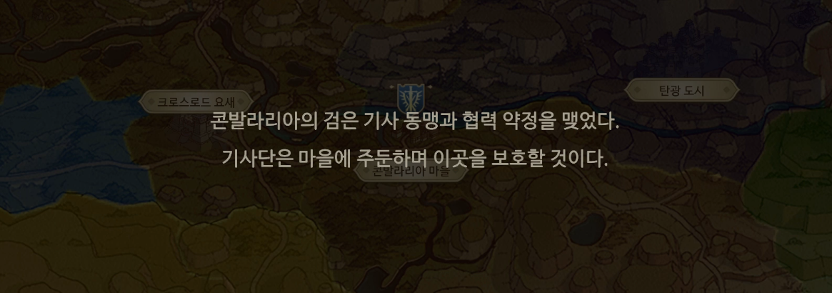 잠시 지도를 통해 세력의 움직임과 왜 기사 동맹이 우리를 돕는지에 대해서 살펴보자. 암흑의 빛은 자신들이 머물고 있는 빈민촌 "탄광도시"에서 나와 서쪽으로 세력을 확장하고자 한다. 이 세력의 확장에 걸림돌이 되는 곳이 바로 지금 보이는 콘발라리아 마을, "스즈란 용병단"이다.