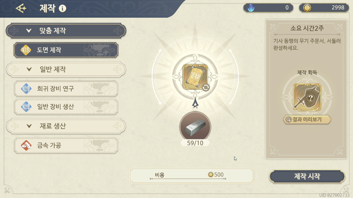 첫단계 퀘스트이라서 그런지 들어가는 재료는 많지 않다. 철괴 10개면 2주 뒤에 제작이 가능하다. 제작하도록 하자