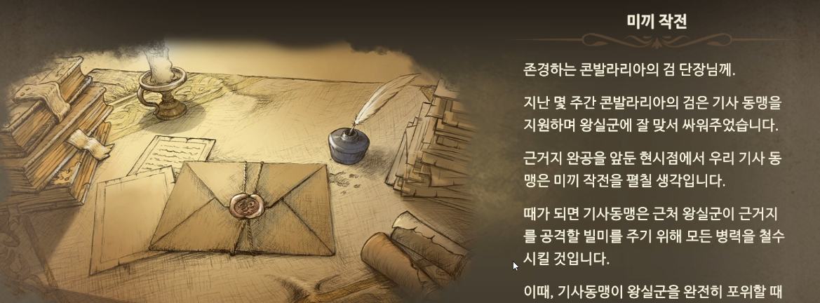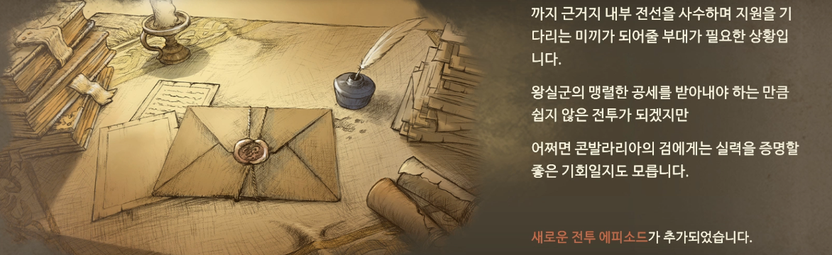 이전 글https://wkqtkdtlr.tistory.com/332 [소드 오브 콘발라리아] 운명의 소용돌이 22주차 - 미끼작전, 캠프 근처의 왕실군 토벌(긴급 에피이전 글https://wkqtkdtlr.tistory.com/331 [소드 오브 콘발라리아] 운명