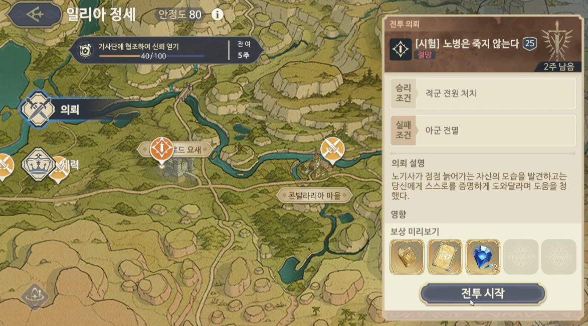 시작하자마자 왕실군 장교가 나와서는 기사 동맹 병사 두명을 보내버린다