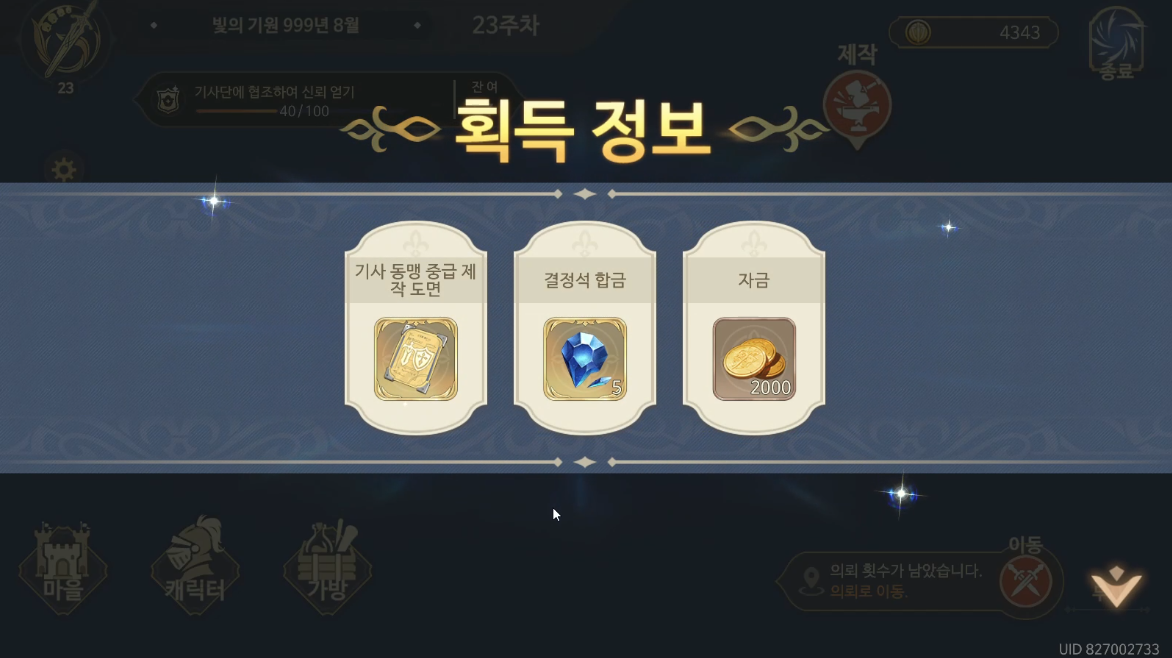이와 같은 보상을 주는데 "기사 동맹 중급 제작 도면"은 후에 쓸 곳이 조금 있으니, 바로 지금 제작하지말고 놔두도록 하자