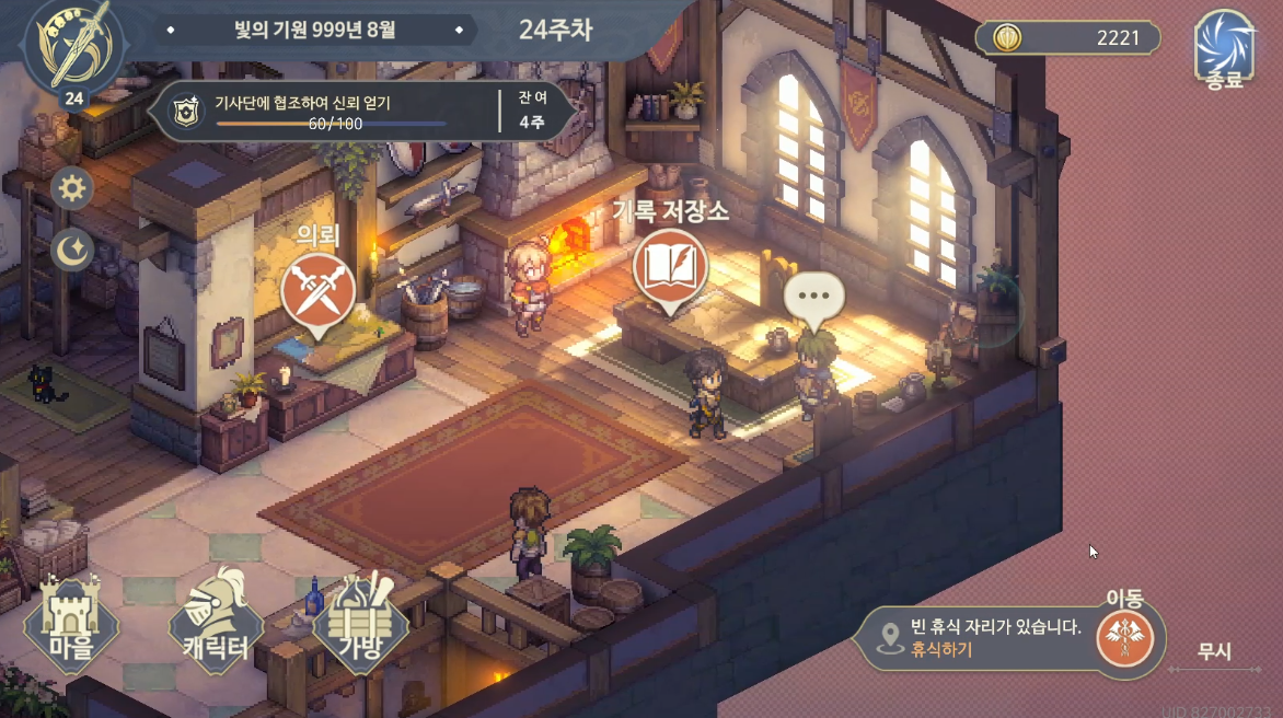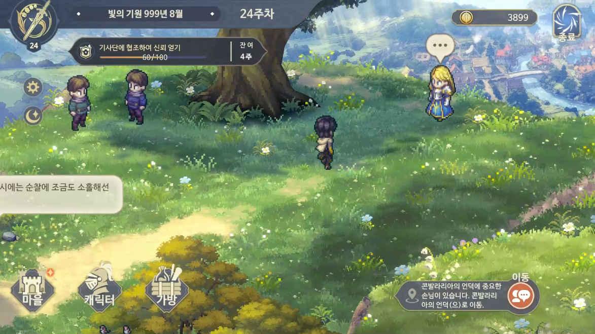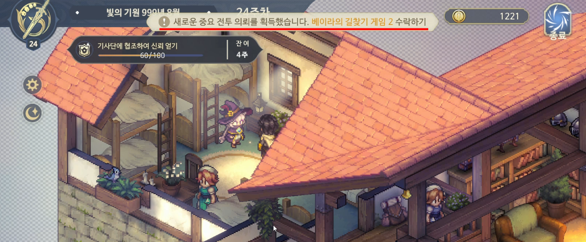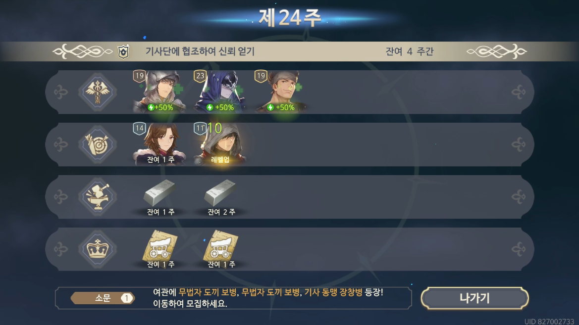 24주차 시작하기 전, 한가지 아래 소문란에 보면 여관에서 드디어 기사동맹군이 모집으로 나타나기 시작함을 알 수 있다. 확실히 기사동맹과 한길을 걷게 됐다는 느낌이 강하게 온다