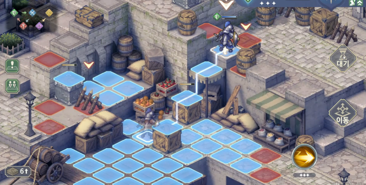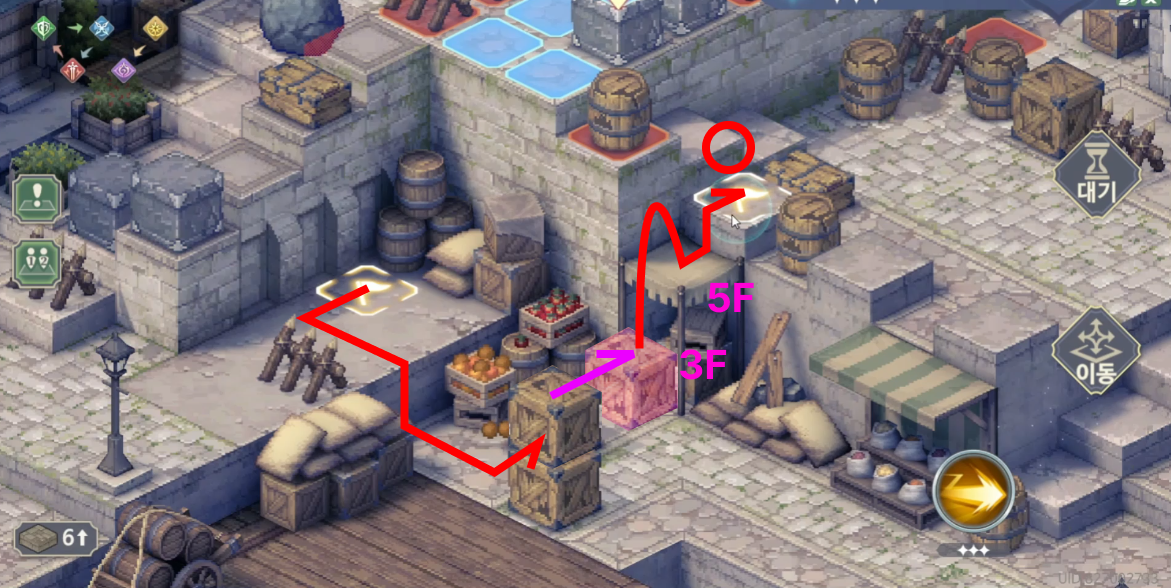 하지만 왼쪽에서 오른쪽으로 갈 때에는 상자를 이용할 수 있다는 점이 다르다. 밑에서 상자를 스킬을 사용해 지붕쪽으로 붙힌 다음, 상자를 밟고 올라가면 점프가 가능해져 곧바로 오른쪽 목표지점으로 이동할 수 있게 된다. 이러면 턴을 소비할 필요가 없다.
