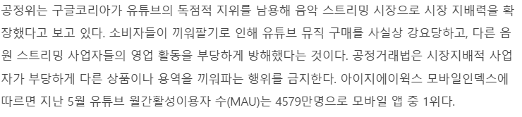 공정위는 구글코리아가 유튜브의 지위를 남용하여 유튜브 뮤직의 구매를 강매하고 다른 음원 스트리밍 사업자의 영업을 부당하게 방해하고 있다고 조사를 마쳤다. 그런데 문제를 삼은 것이 위에서 살펴 본 "망 사용료" 나 "음저협과의 저작권 사용료 부당 계약" 을 들고 온 것이 아니라, 유튜브 프리미엄에 뮤직 프리미엄 상품을 "끼워 팔았다." 라는 점을 문제 삼았다는 것