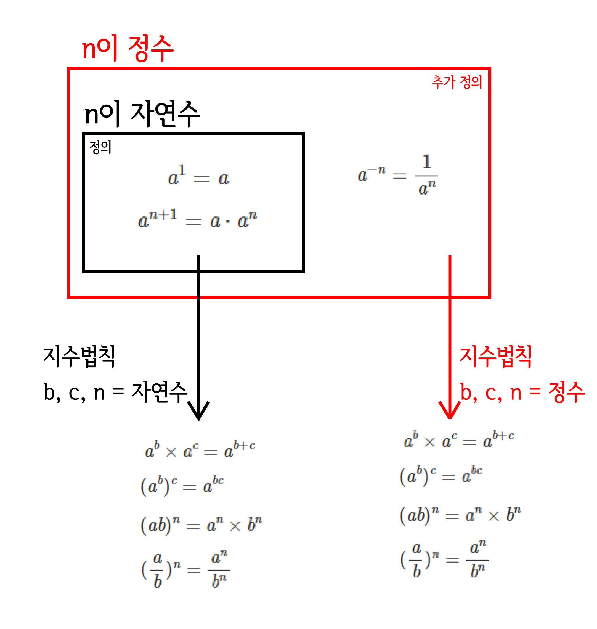 n과 m이 자연수일 때, 그 두 수를 곱하거나 더하더라도 그 값은 당연히 자연수가 되지만, 뺄 때는 반드시 자연수가 된다고 보장할 수 없다. 왜냐하면, n, m이 같을 때는 0이며, m이 더 크면 음수가 되기 때문(4번 식 참고). 하지만 이제는 a의 n-m승에 대해서 어떻게 정의하는지에 대해 알게 되었으니, 이제는 지수가 정수더라도 상관이 없다. 본래는 증명을 해야 하지만, 직관적으로라도 자연수일 때 적용됐던 지수의 법칙들(결합, 분배 등등)이 정수에서도 똑같이 적용될 것 같다는 아이디어를 얻게 되었다는 것이다. 그리고 실제로도 똑같이 적용이 된다.