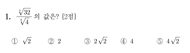 2025학년도 대학수학능력시험 9월 모의평가 (2024. 9.) 문제는 단순하다. 쓰여져 있는 식의 값은? 즉, $$ {\sqrt[4]{32}} \over {\sqrt[8]{4}} $$는 다음의 보기 중 무엇과 같냐 묻는 것이다. 이 문제를 풀기 위