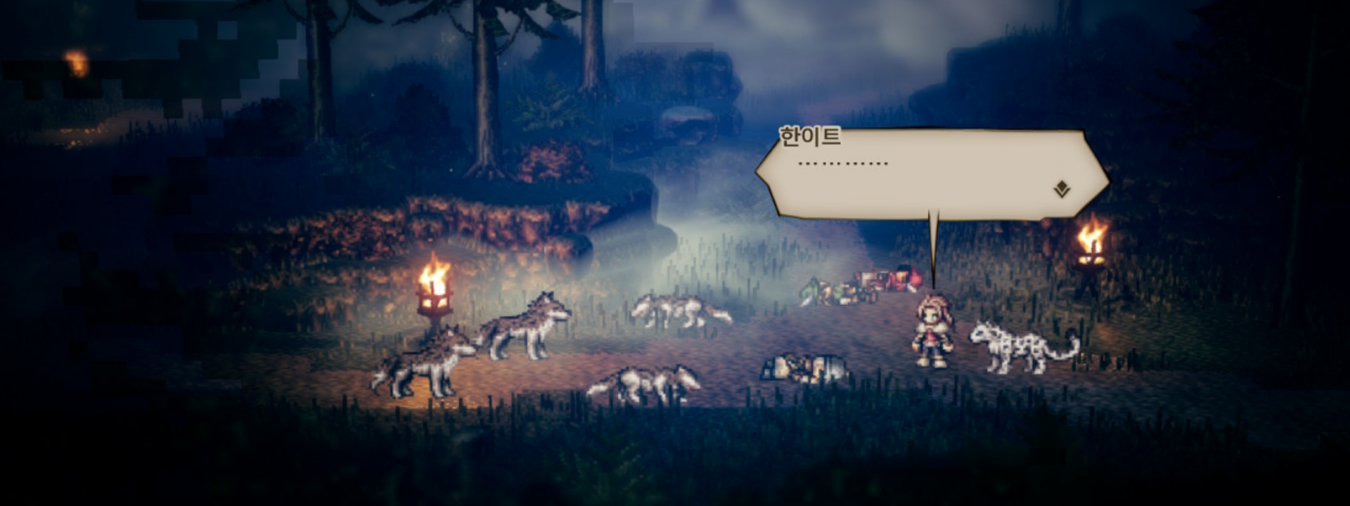 너희들의 원수는 내가 갚아주마(안쪽의 늑대 한 마리가 한이트에게 다가온다) 한이트 응? 내가 돌아올 때까지 그들의 사체를 지켜줄 테냐?