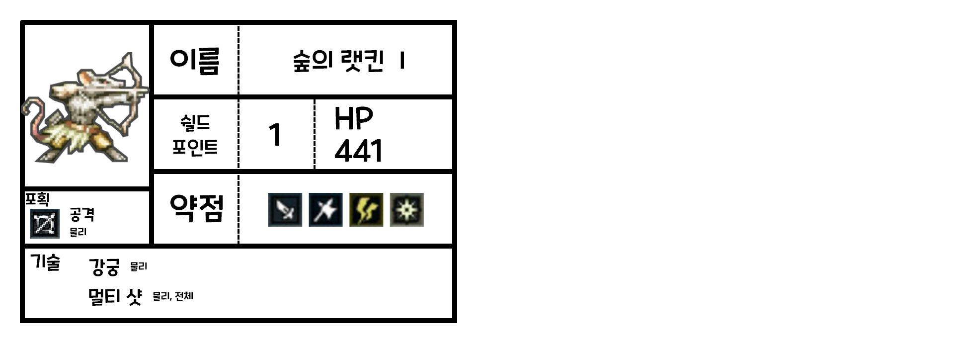 지금부터는 몬스터 카드에 포획시 마물의 특기 기술에 대해서도 제공한다. 속삭임의 숲에서 포획 전용 마물은 이렇게 두 가지이다.