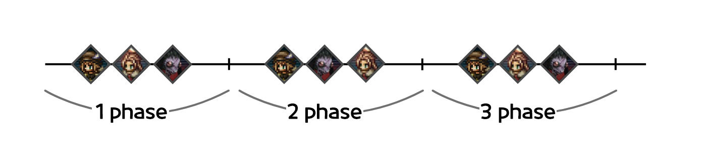 따라서 다음과 같은 행동순서일 때, 한이트가 1페이즈에 점착사를 사용하면, 1페이즈에서는 이미 적의 행동순서가 마지막에 위치해 있으므로 그대로 넘어가고, 2페이즈만 점착사 효과에 따라 행동순서 마지막으로 이동하게 된다.