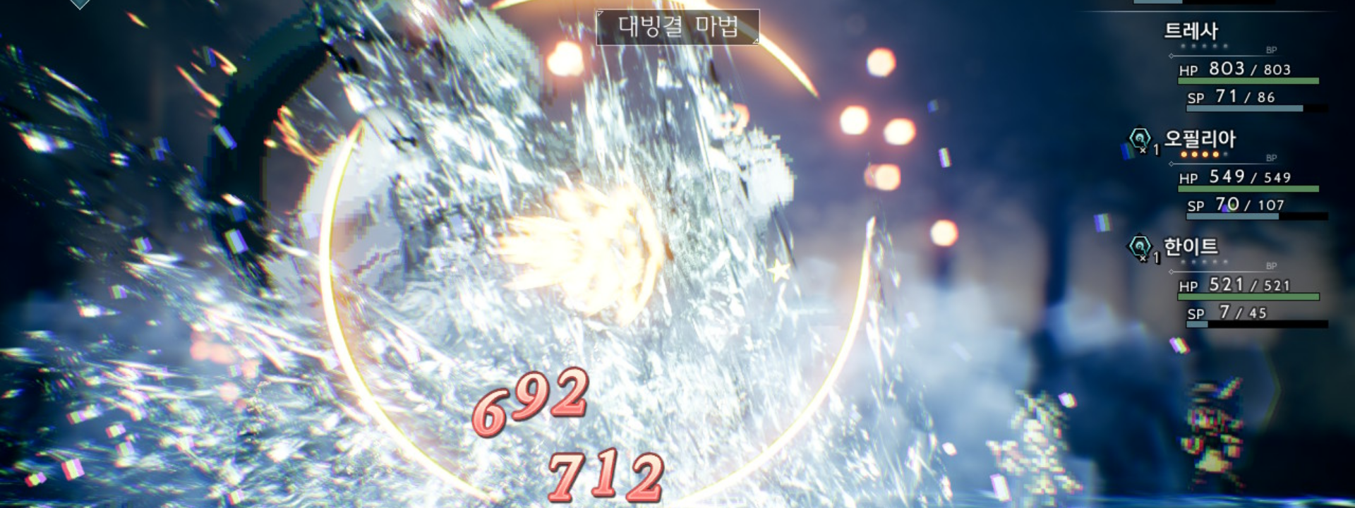 이 때, 물리공격을 하게 되면 위와 같이 큰 대미지로 이를 되갚아준다. 평타한번 때렸다가 342대미지를 받고 정신이 아득해진 오필리아이다. 속성공격은 상관없으니 사이러스는 자유롭게 딜을 넣으면 된다. 또한 오필리아 상태를 보면 "반사의 베일"이 둘러져 있지만, 해당공격은 물리 공격으로 반사의 베일로 반사되지 않는다는 점 참고