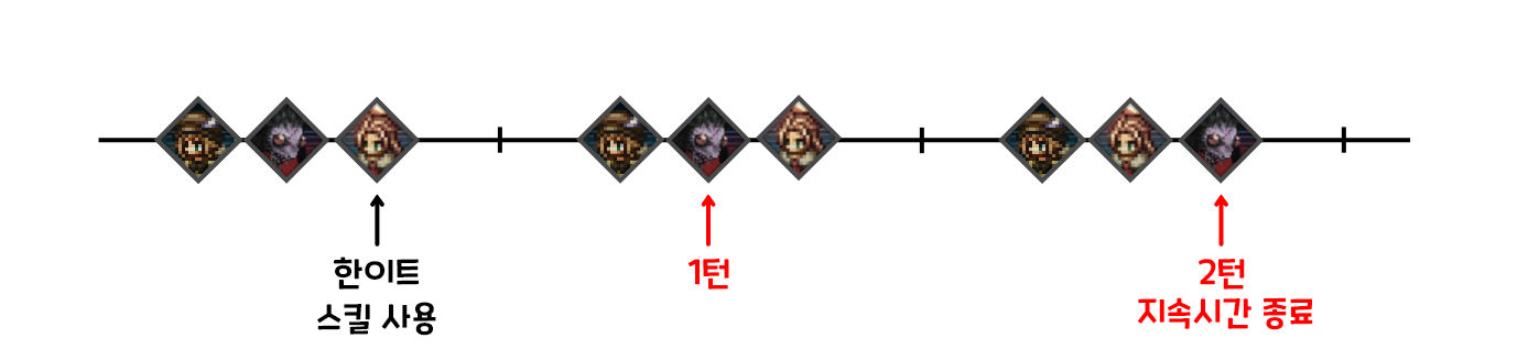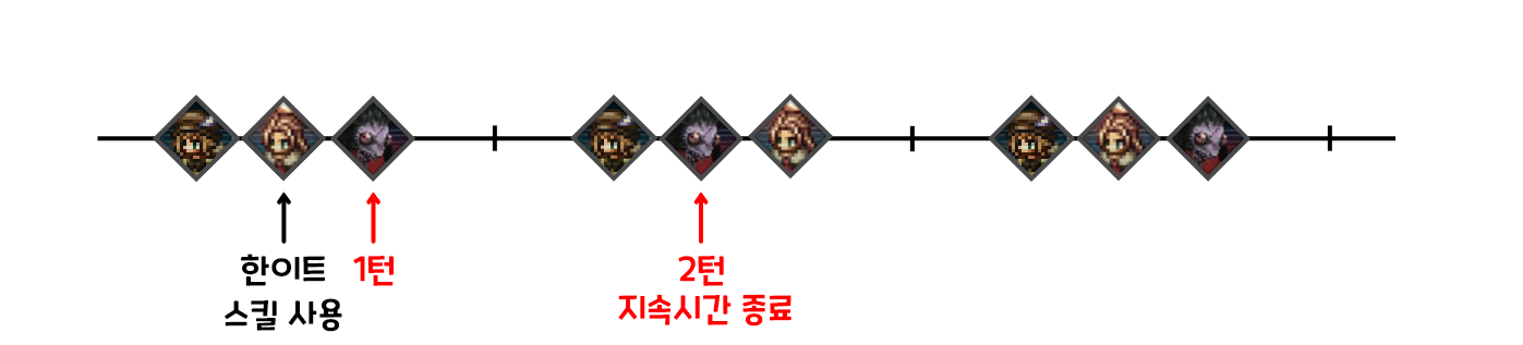 한이트가 똑같이 1페이즈에 스킬을 사용했어도, 3페이즈에 와서야 지속시간이 끝나게 된다. 즉, 똑같은 지속시간이라도 위의 경우에는 그 사이에 한이트가 한번도 이를 활용하지 못했지만, 아래의 경우에는 지속시간이 종료되기 전 한이트의 차례가 두 번이나 찾아오게 된다.