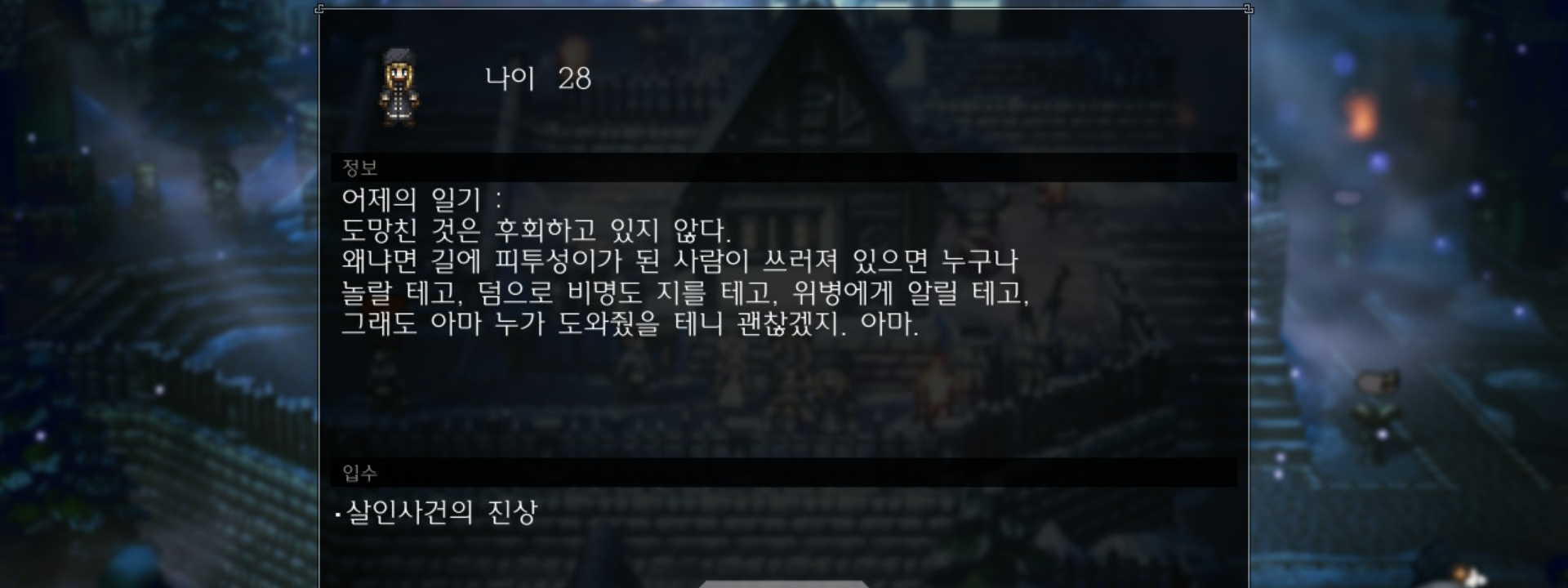 NPC의 소지품을 가져오는 방법은 두 가지이다. 값을 치르고 구매하거나 몰래 뺏거나. 값을 치르는 방식이 트레사의 "매입"이고, 몰래 뺏는 방법이 지금은 파티에 없지만 테리온의 "훔치기"이다. 결국 지금 우리의 상태로는 열쇠를 구할 수 있는 방법이 없다.
