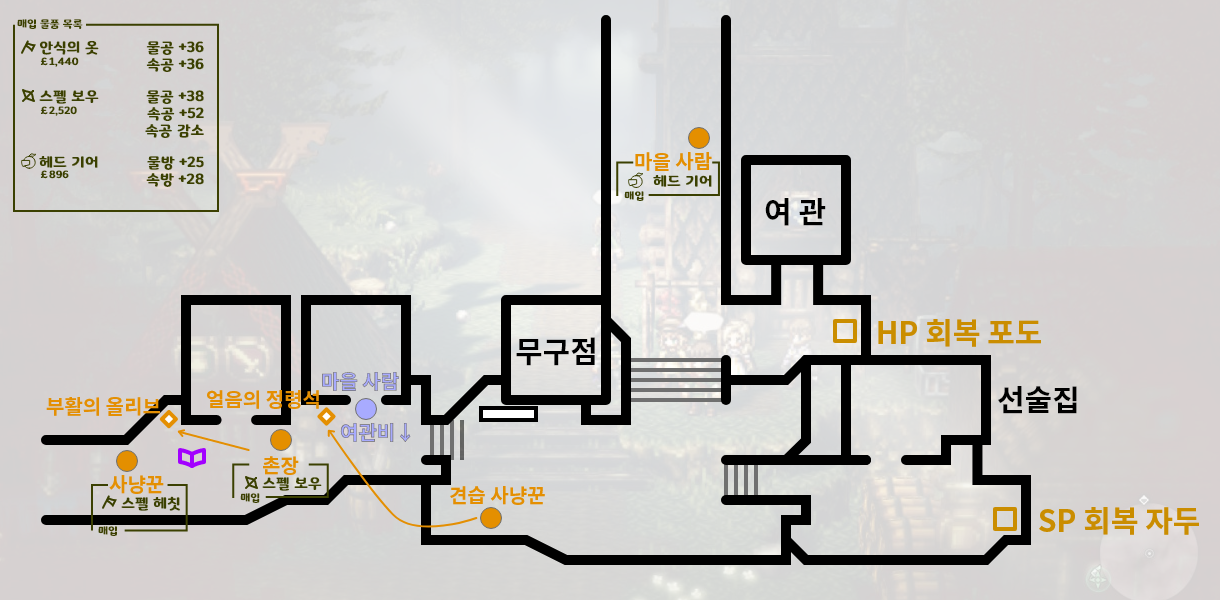 속삭임의 동굴에 가기 전, 장비를 정비하고 갔을 때와 무구점의 상품 목록이 크게 다르지 않아 특별히 준비할 것은 없지만, 트레사 매입을 통해 여관 옆 마을사람으로부터 헤드 기어를 구매할 수 있다.