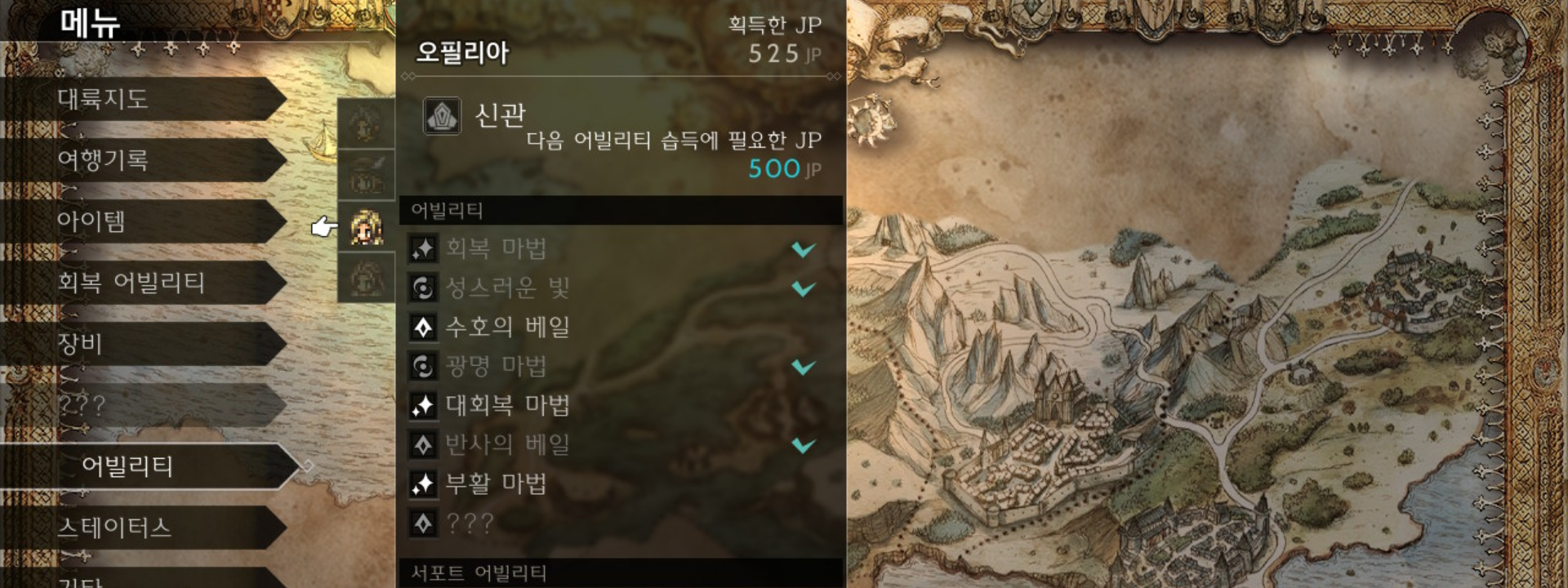 떠나기 전 오필리아도 500JP를 얻어서 어빌리티를 하나 더 배울 수 있게 되었다. 특별히 먼저 배워야 할 스킬은 없으므로, 대회복 마법을 배우기로 한다.