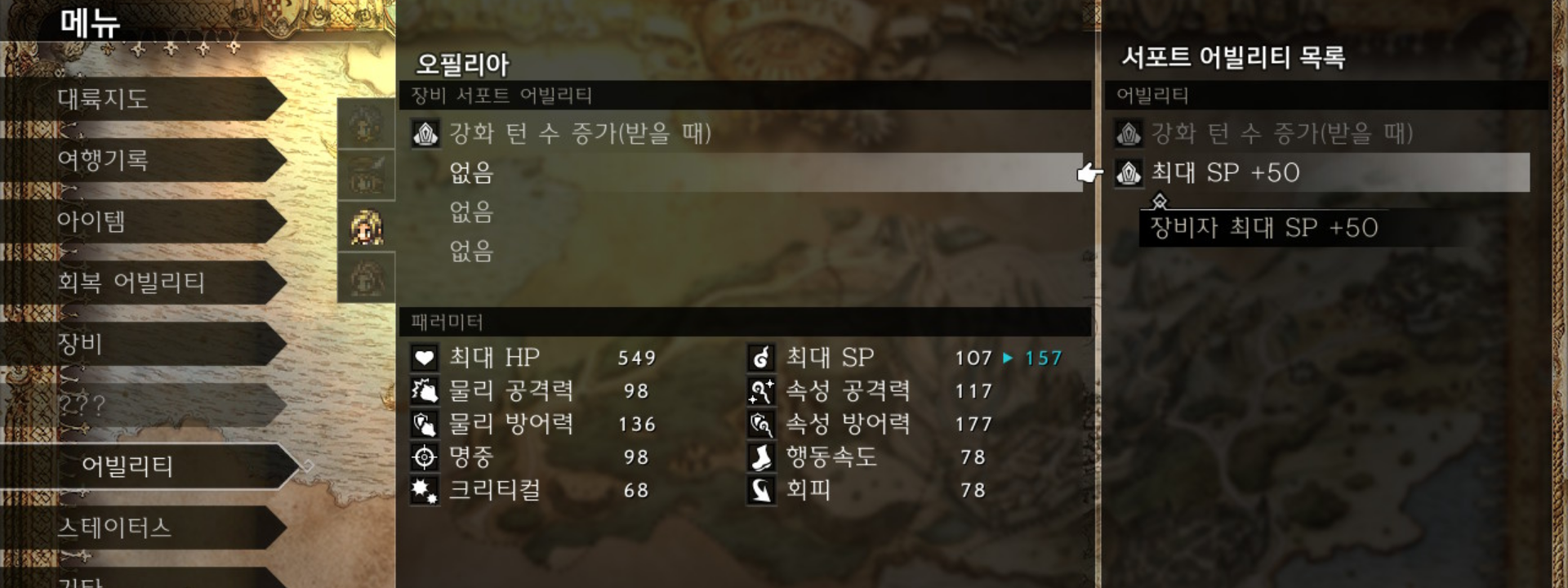 오필리아에게는 어빌리티보다 지금 배울 두번째 서포트 어빌리티가 너무나도 필요했다. SP+50으로 안 그래도 부족했던 SP를 많이 보완해준다. 서포트 어빌리티까지 모두 장착하고 테리온이 있는 "볼더플"로 출발하자.