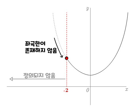 $x > -2$인 구간에서야 $-2$와 $x$사이에는 반드시 실수구간이 존재하니 좌극한이 있을 수 있겠지만, $x = -2$일 때는 $-2$보다 작으면서 $-2$보다 큰 실수구간이란 말로만 표현하더라도 존재할 수 없기 때문에, 좌극한이 정의되지 않는다. 따라서 $f(x)$는 $x=-2$에서 좌극한이 존재하지 않기 때문에, 정의에 따라 연속이 아니게 된다.