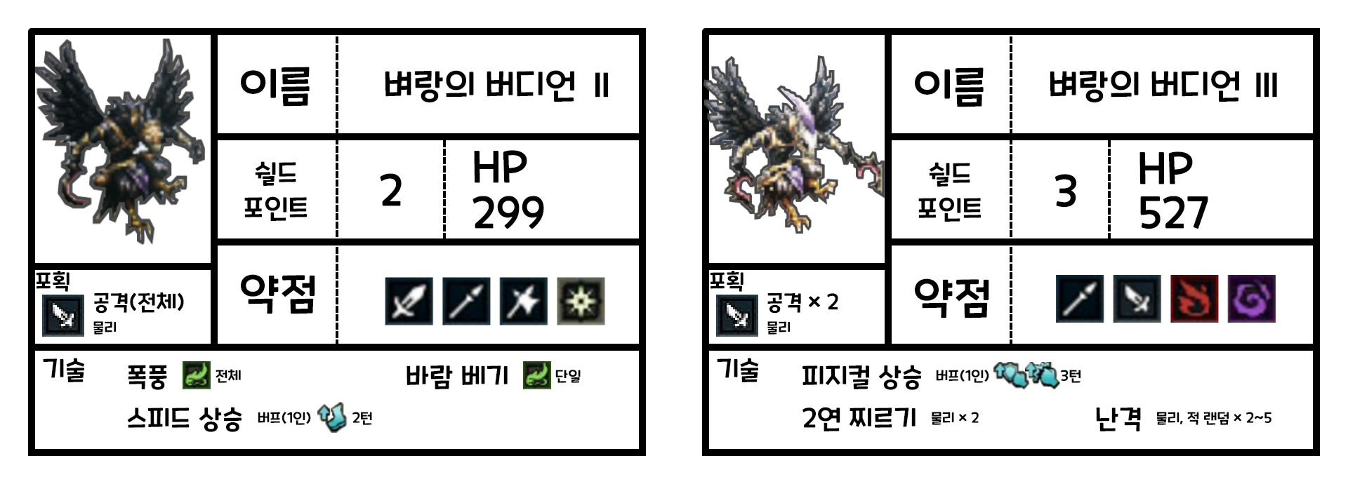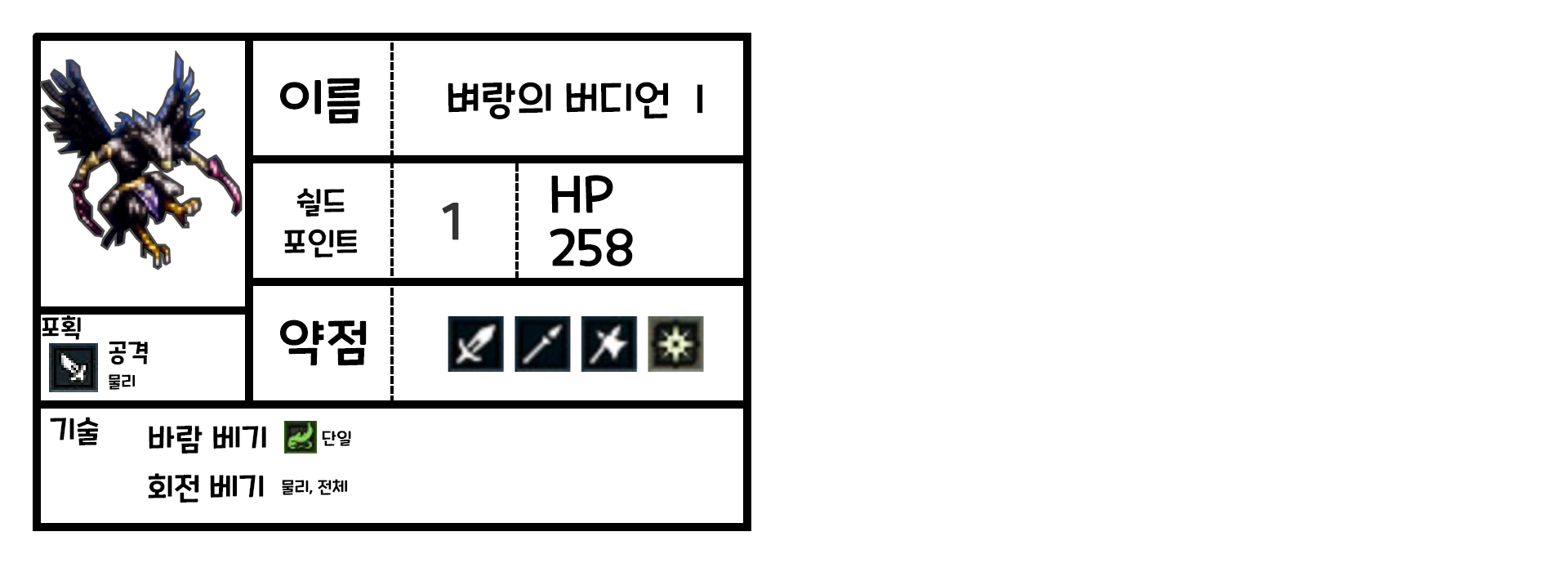 바람 속성의 전체 공격도 있어서 조금 까다로울 수 있다. 물론 만날 확률은 많이 낮아서 운이 좋다면 볼더폴까지 진행하는데 한번도 만나지 않을 수도 있다.