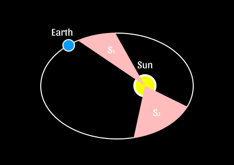 일정 시간 동안 지구가 공전궤도상 움직이는 거리와 출발점, 도착점, 태양이 이루는 호 형태의 넓이를 $S_1$이라고 할 때, 케플러는 태양에서 가까운 쪽이 더 빨리 움직인다고 하였기 때문에, 상대적으로 태양에서 가까운 쪽은 같은 시간이라도 더 많이 움직이게 된다($S_2$).