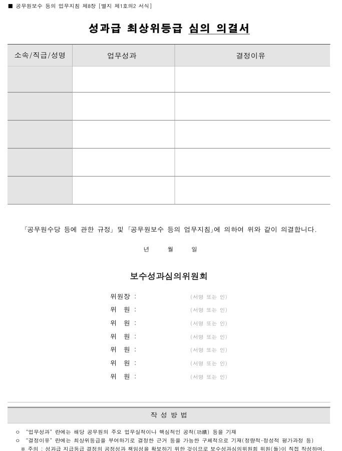 아무래도 보수, 예산과 직결되는 내용이다 보니, 가장 많은 돈을 받는 최상위등급(S등급)을 부여할 직원에 대해서는 특별히 업무실적, 결정근거 등을 포함한 "심의의결서"를 작성하여야 한다.