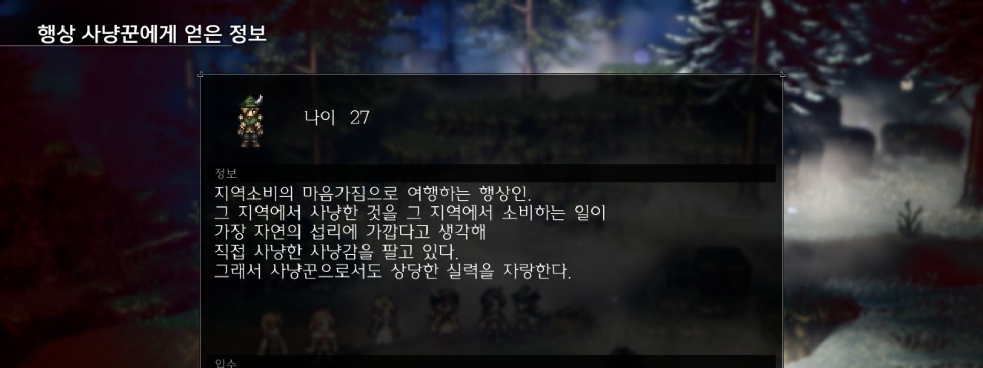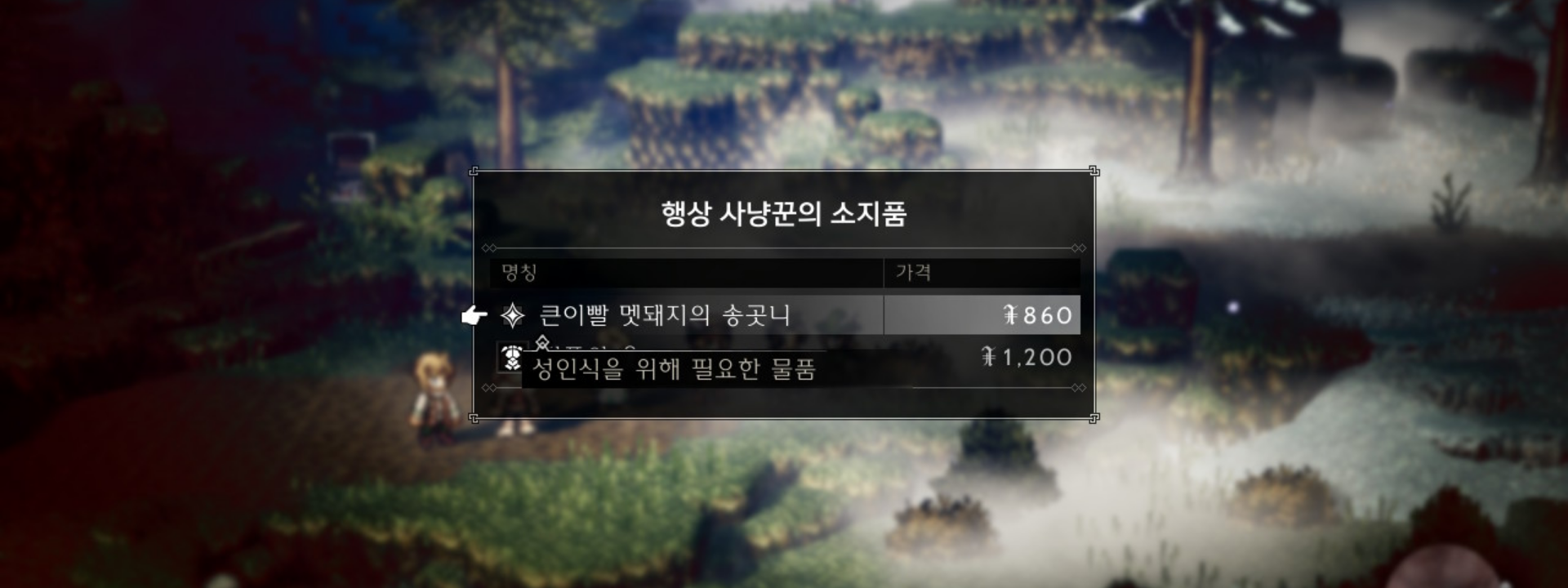 직접 멧돼지를 잡아주면 좋겠지만, 시와르키 → 플레임그레이스 방면으로 가다보면 중간에 행상 사냥꾼이 있다. 탐색을 통해 설명을 보면 직접 사냥한 사냥감을 팔고 있다고 한다. 우리는 멧돼지의 이빨이 필요하니 NPC에게 매입해보자