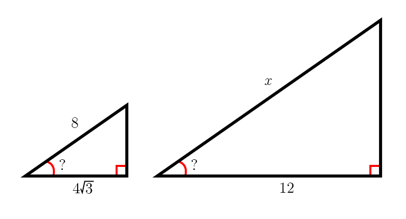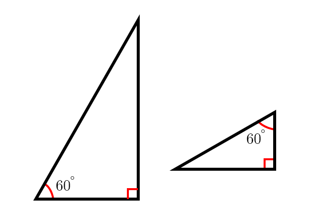 이 두 삼각형은 서로 닮음일까? 삼각형의 내각의 합은 180º이므로, 지금 표시되지 않은 나머지 한 각은 두 삼각형 모두 30º로 같다. 그렇다면, 세 각의 크기가 모두 같기 때문에, 이 두 삼각형은 닮았다고 할 수 있겠다. 즉, 우리는 "직각삼각형"이라는 특수한 삼각형에서 만큼은 직각을 제외한 단 하나의 내각만 같아도 모두 닮았다고 할 수 있다