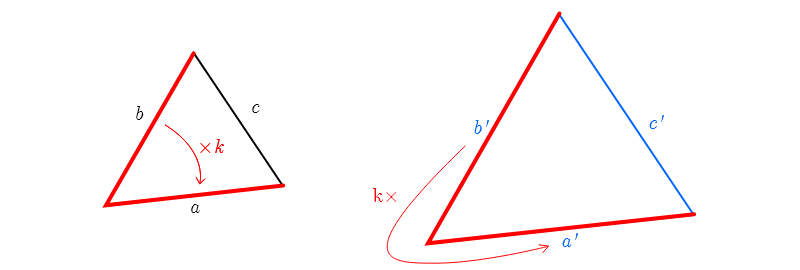 이 두 삼각형은 서로 닮았다. 닮았다는 것은 세 쌍(여기에서 세 쌍은 $a, \, a'$, $b, \, b'$, $c, \, c'$)의 길이의 비가 같다는 것이므로 다음과 같이 표현할 수 있다.