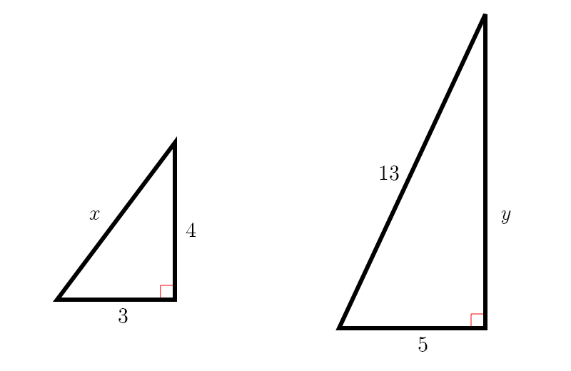 위의 직각삼각형들은 모두 두 변의 길이가 주어져 있다. 이를 통해 나머지 한 변의 길이인 $x, \, y$를 구해보자.