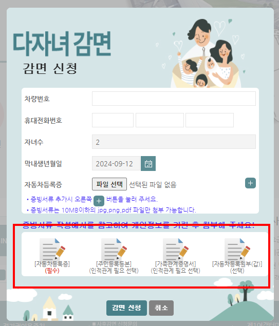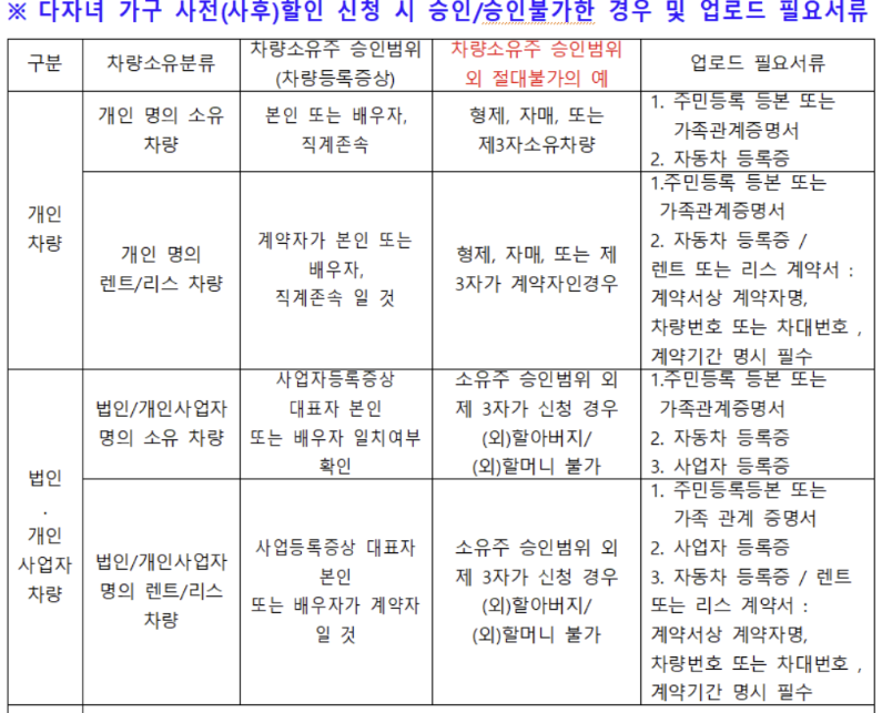 당연히 다자녀임을 증명할 수 있는 서류(가족관계증명서 또는 주민등록등본)과 이를 부정사용하는 것을 방지하기 위한 서류(자동차등록증, 자동차등록원부(갑지))가 필요하다. 우리 가족이 다자녀임을 이용하여 다른 사람이 할인받는 것을 막기 위해서이므로, 반대로 이야기하면 자신 명의의 차량만 감면이 가능하다. 이 경우는 예외가 없으므로, 형제·자매 명의의 차량이라하더라도 절대 감면 받을 수 없다.