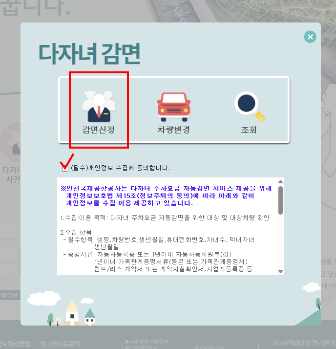 인천공항만 특별하게 "인천공항 정기권 관리 시스템"에서 다자녀 할인 신청을 할 수 있다. 한국공항공사에서 운영하는 "전국공항 주차홈페이지"는 인천공항과 관계가 없으니 주의