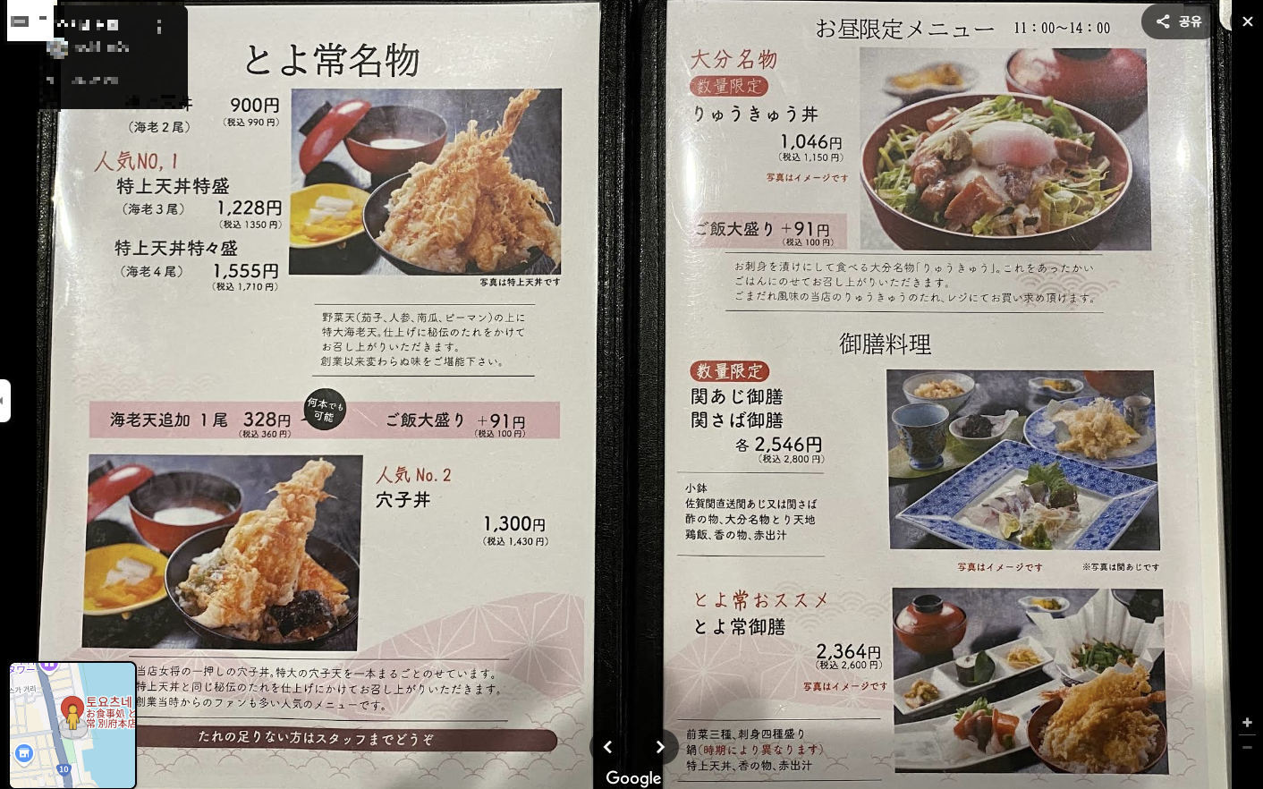 위에 인기(人氣) 1번 메뉴는 텐동(天丼)이다. 텐동 뒤에 盛이라는 한자는 음식을 많이 쌓은 것을 표현할 때 사용하는 한자이다. "特盛 → 많이 쌓았다, 特々盛 = 特特盛 → 진짜 많이 쌓았다" 정도로 해석하면 되는데, 결국 새우튀김의 개수 차이이다. 3개면 1,228円, 4개면 1,555円이다.