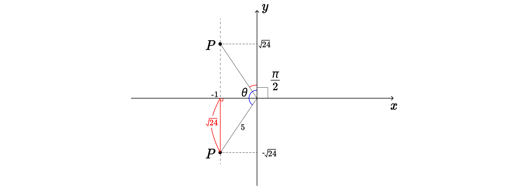 $\theta$가 빨간색일지, 파란색일지는 알 수 없다. 어찌됐든 피타고라스의 정리로 높이가 $\sqrt{24}$는 것은 알 수 있으므로, 점 P는 $(-1, \, \sqrt{24})$이거나, $(-1, \, - \sqrt{24})$ 이다.