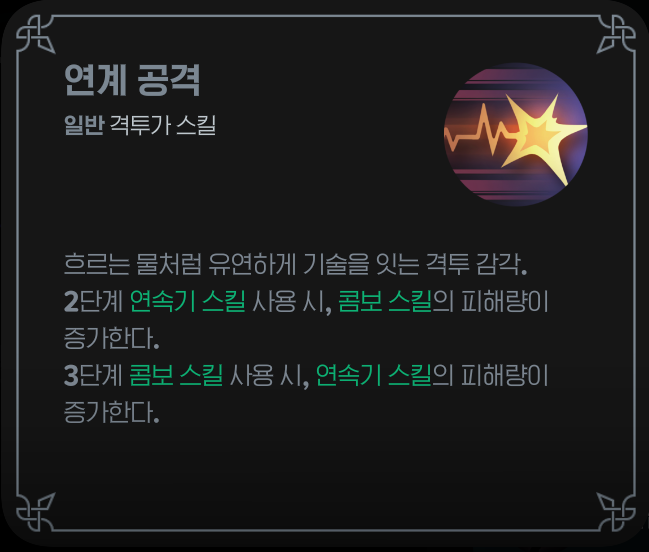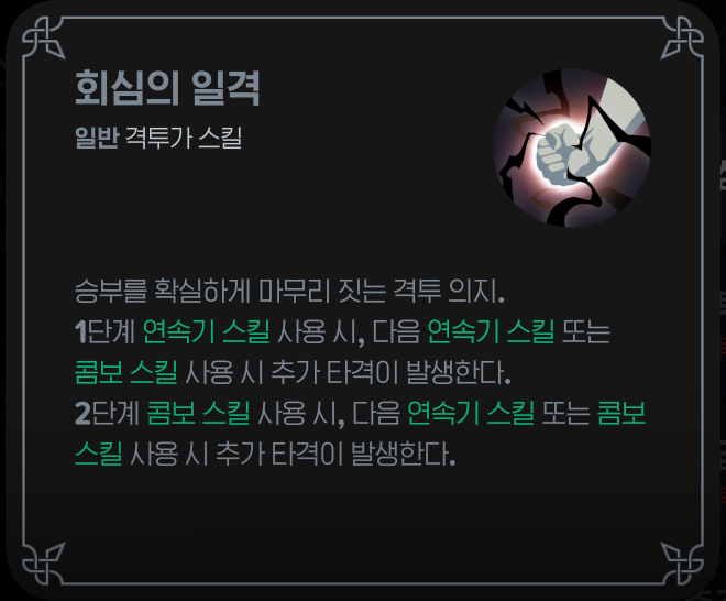 회심의 일격을 통해 "1단계 연속기에서 다음 연속기를 쓰거나 콤보스킬로 강제 연결할 때" 또는 "2단계 콤보 스킬에서 피니시 콤보를 넣거나 연속기 스킬로 강제 연결할 때" 추가타를 준다