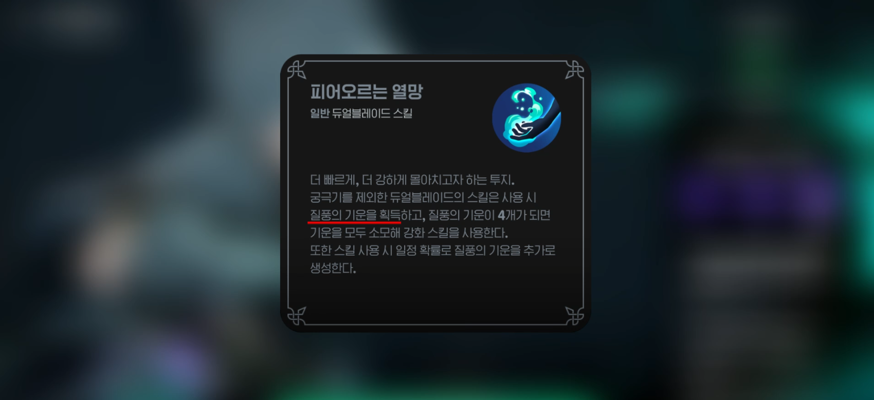 스킬을 사용하면 질풍의 기운을 획득하고, 그 질풍의 기운을 4개 모으면 이를 모두 소비하여 스킬을 강화한다