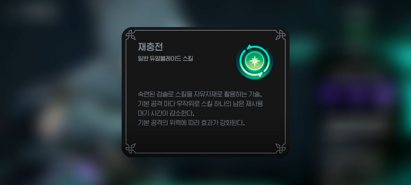 결국 스킬 쿨을 빨리 돌리는 것이 무엇보다 중요한데, "재충전"이라는 패시브를 통해 기본 공격마다 무작위로 스킬 하나의 재사용 대기시간을 감소시킨다. 직접 실험해보진 않았지만, 쿨타임 감소 옵션보다 기본공격속도를 올리는 것이 세팅에 더 유리하지 않을까 싶다. 애초에 그렇게 설계한 듯하고