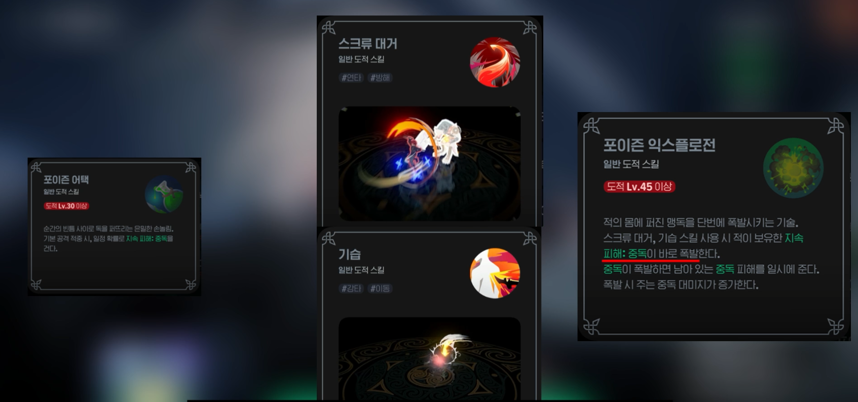 중독에 걸린 상대에게 "스크류대거" 또는 "기습" 스킬을 사용하면, 중독이 터지면서 대미지를 준다. 이 때, 남아있는 중독 피해를 일시적으로 주기 때문에, 중독을 빨리 걸고 포이즌 익스프로전으로 폭발 시키고 다시 빨리 중독을 걸어 순간 딜을 폭발시키는 형태이다.
