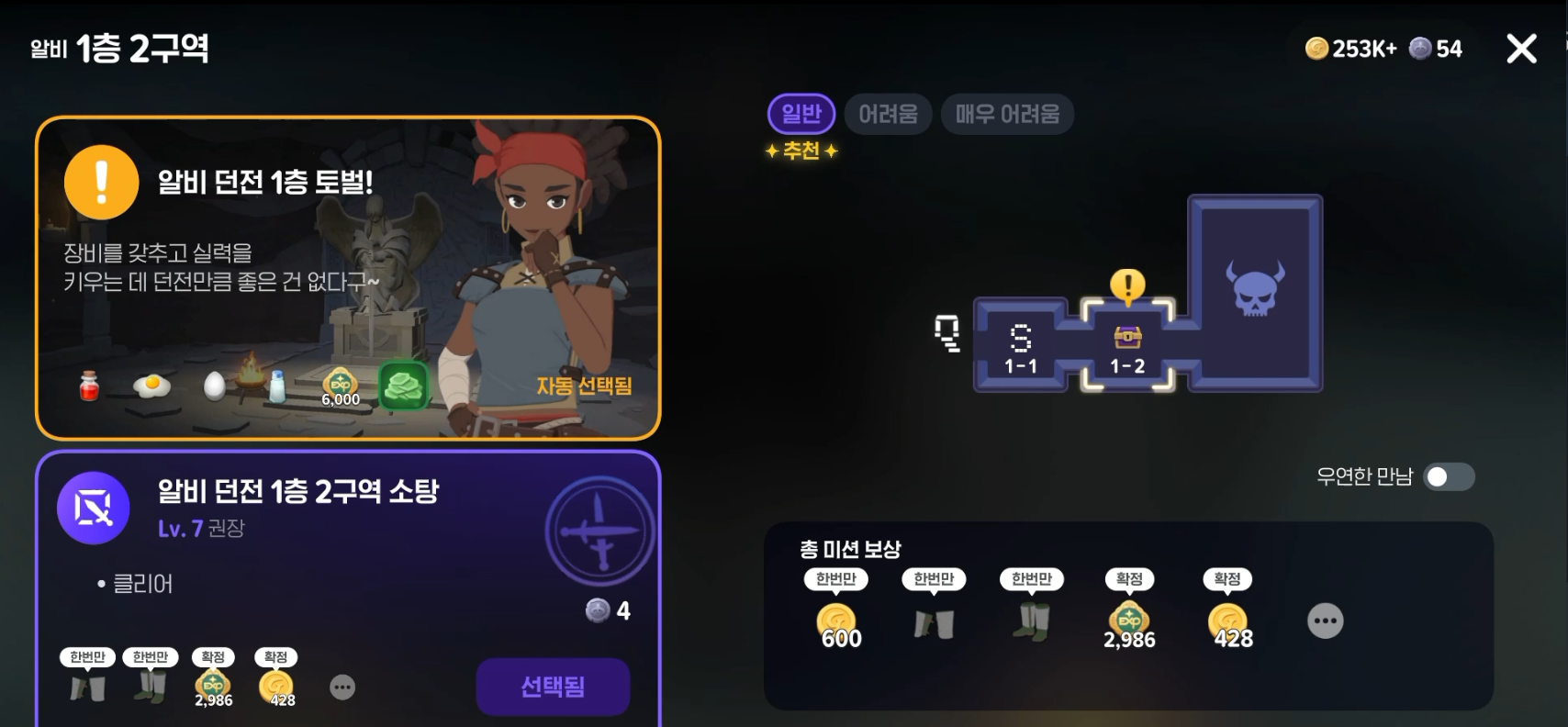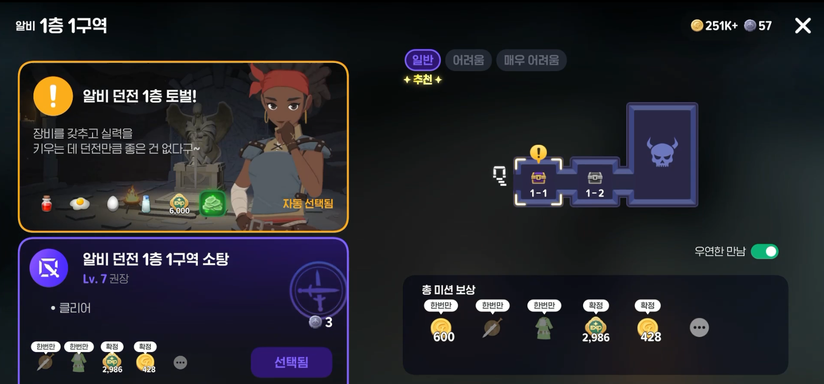 던전은 클리어 자체로 주는 주요 보상과 랭크에 따른 추가 보상이 있다. 그리고 이번에는 퀘스트 클리어를 위한 진입이므로 맨 위에 "알비 던전 1층 토벌!" 이라는 퀘스트도 함께 선택되어 있다. 우연한 만남을 선택하면, AI이긴 해도 무작위로 다른 플레이어들을 호출할 수 있다. 이는 밑에서 조금 더 살펴보기로...