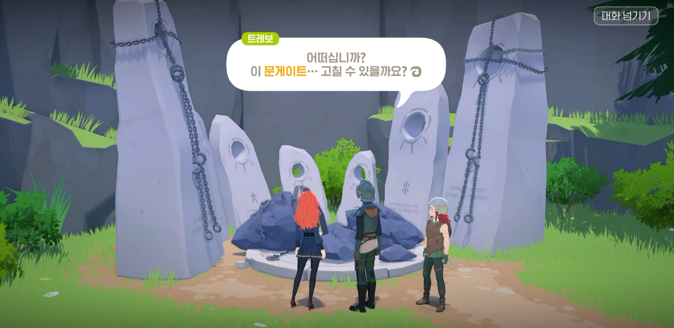 알비던전 1층을 클리어하고 밖으로 나오면 트레보와 한 여성이 문게이트 앞에서 주인공을 기다리고 있다