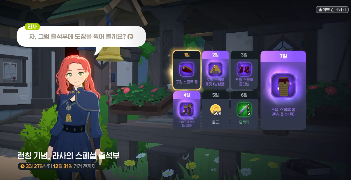 여기까지 완료되면 라사와 레이널드가 매일 출석부 보상을 준다. 출석 보상마저 퀘스트화 되어 있다니...