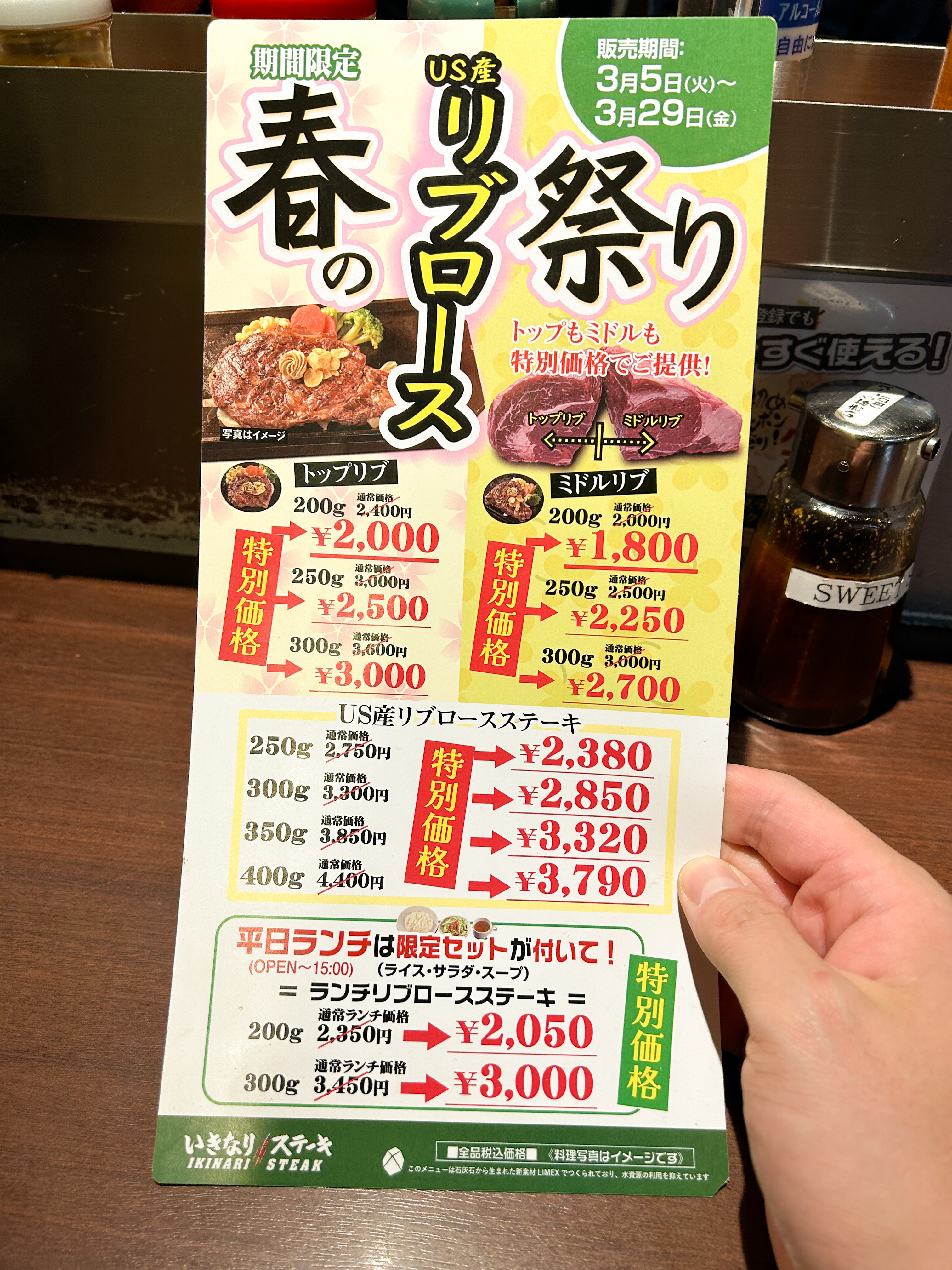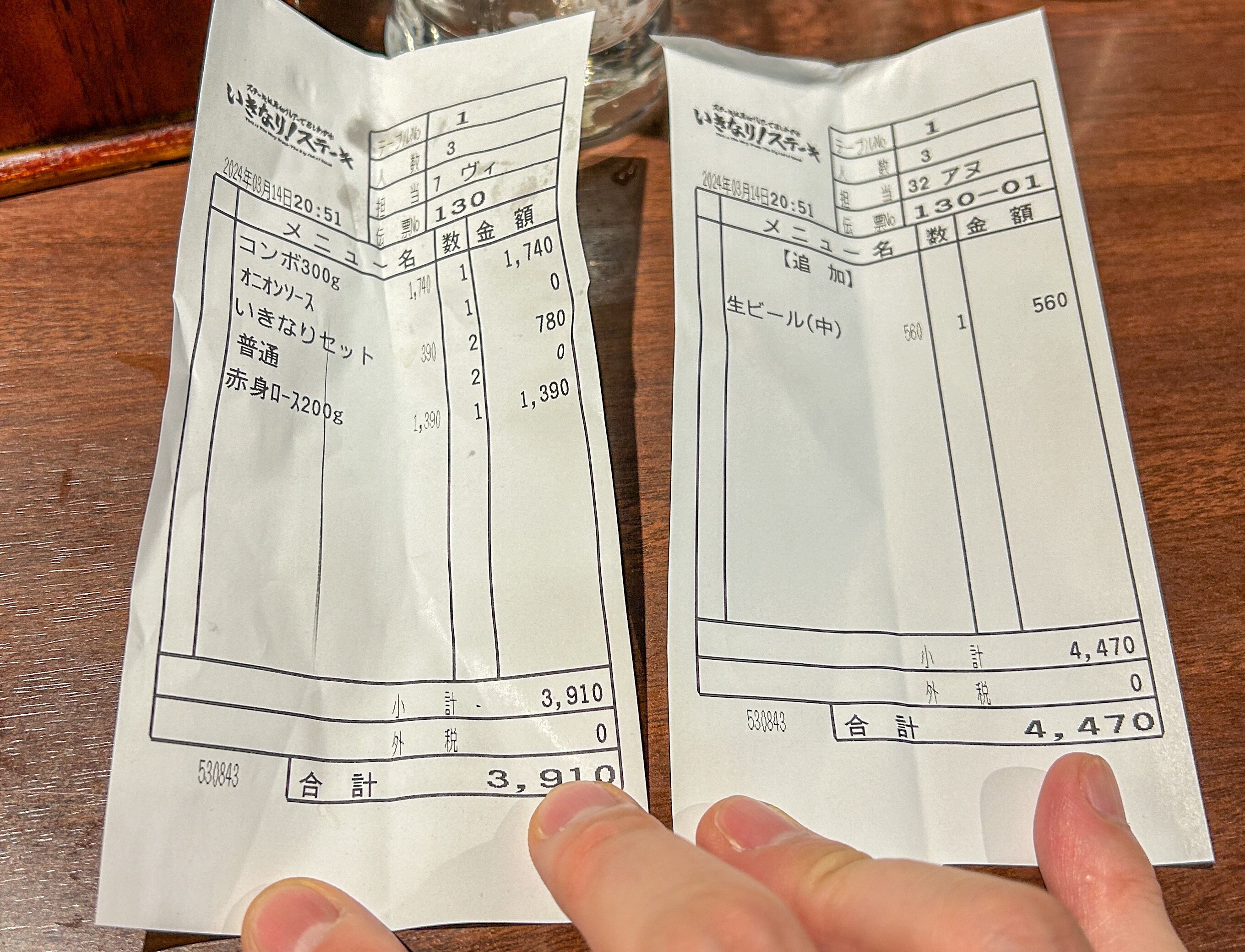 고기 총 500g에 생맥주 1잔의 가격은 4,470엔이다. 생맥주 포함가격이니 사실상 100g에 만 원이 안된다. 하지만 맛은 뛰어나다. 고급 한우 스테이크같은 부드러움은 아니더라도 부담 없이 스테이크를 즐기고 싶다면 이키나리에 방문해보는 것을 추천한다.