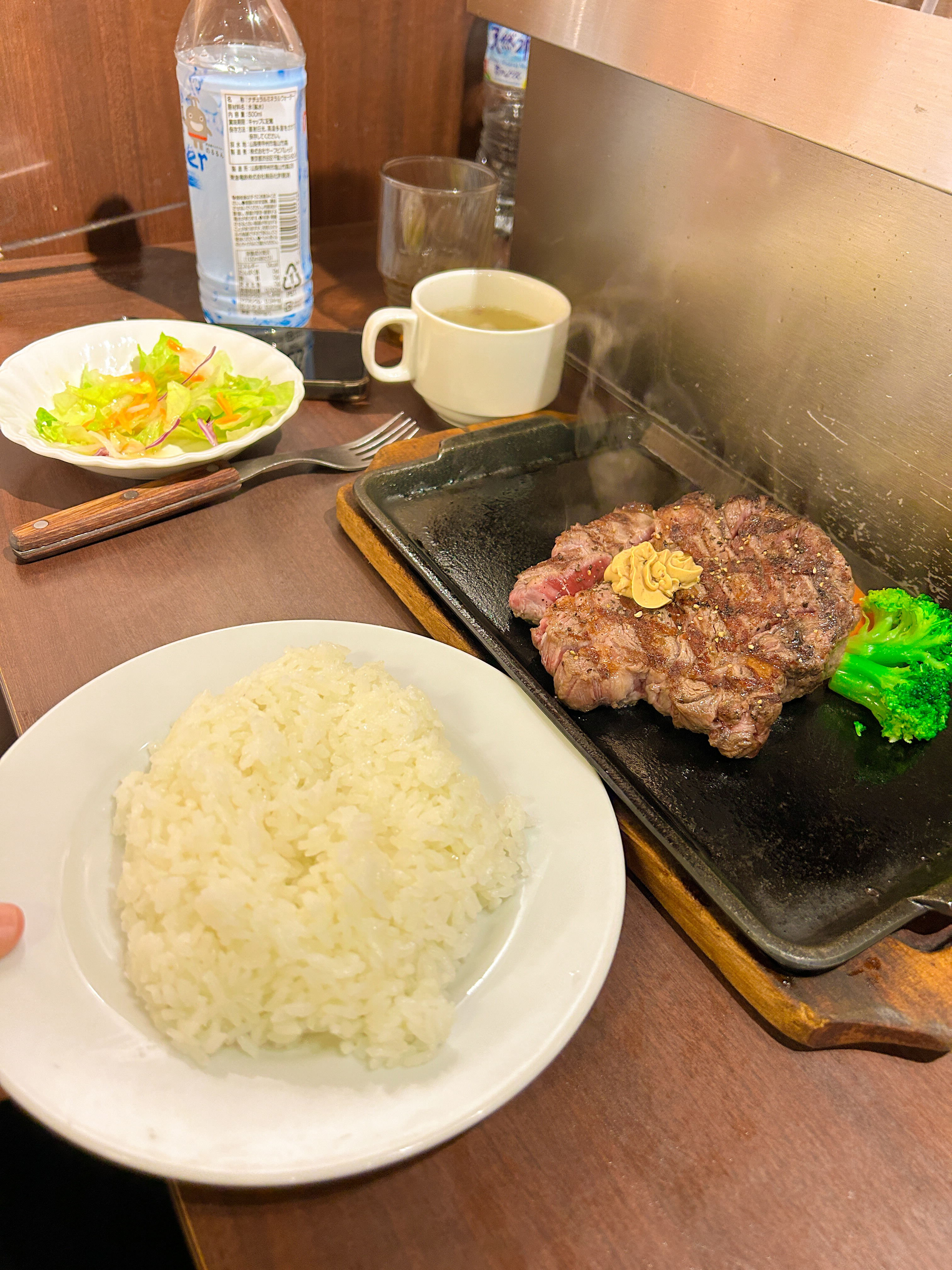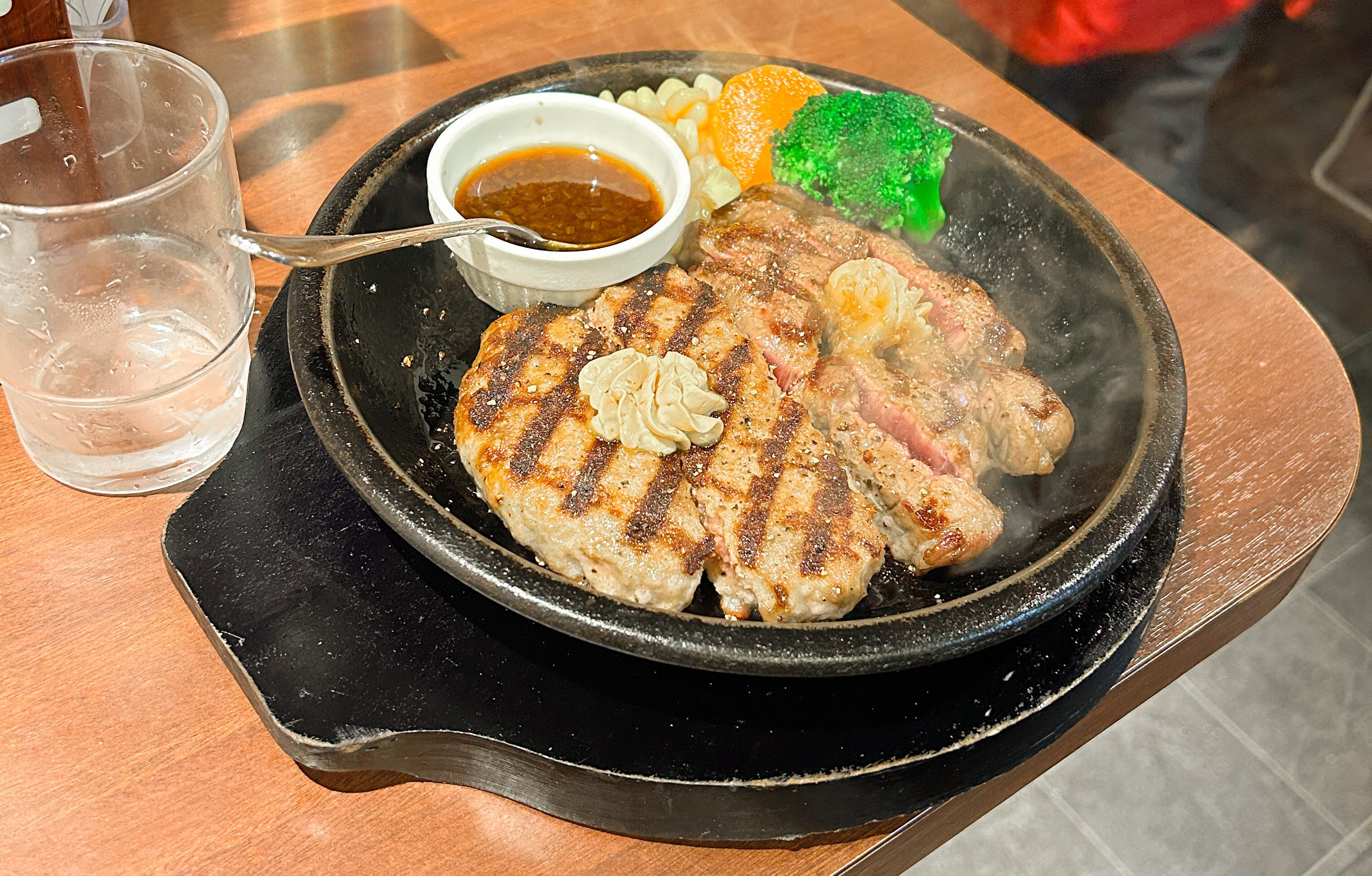 콤보는 함바그와 스테이크가 함께 나온다. 소스는 어니언, 머스터드 등 4가지 소스가 있는데 그 중 어니언을 골라서 먹었다. 싼 부위라 고기가 조금 질긴 것은 어쩔 수 없지만, 가격을 생각하면 나쁘지 않다. 콤보는 300g에 세트비 포함 2,500엔 정도이다.