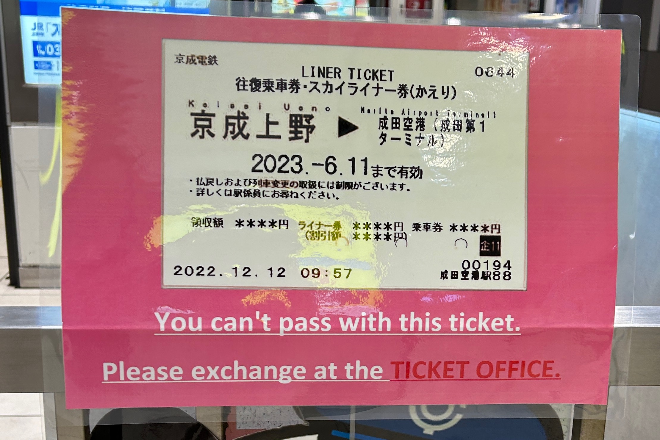 입구에 친절하게도 위와 같은 프리티켓은 들어갈 수 없으니 교환하고 오라고 쓰여 있다. 정상적인 티켓이라면 이미 좌석이 정해진 티켓이므로, 위와 같이 유효기간(〜まで有効) 없다. 또한 도착지와 좌석이 정해져 있다. 스카이라이너는 전석 지정석으로 운행되므로 오사카에서 타는 하루카특급열차와는 조금 다르다. (하루카는 특정 차량이 자유석이다.)