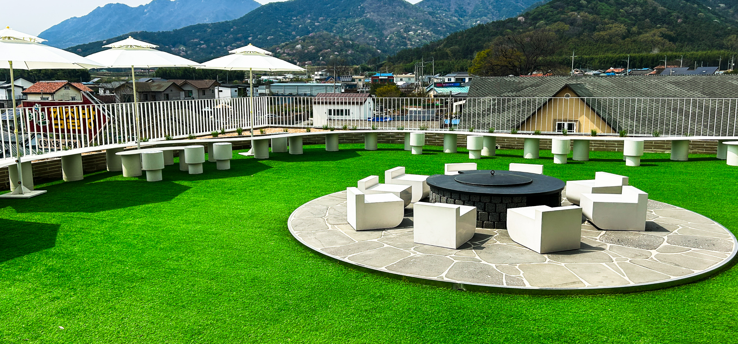 밖의 테라스도 꽤 넓은 공간이 있고, 1층에서 이쪽으로 계단을 통해 올라올 수도 있다. 야간에 와보지는 않았지만, 날이 어두워지면 가운데 불멍을 하는 공간도 생기고 조명도 있어 꽤 괜찮다는 이야기를 들은 적이 있다.