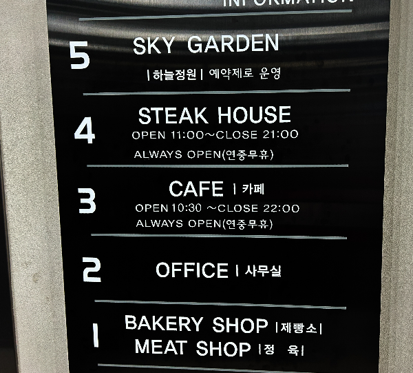 카페는 총 5층으로 되어있으며, 4층에 스테이크하우스가 있어서 그런지 1층에서는 고기를 팔고 있다. 카페를 생각하고 온 사람에게는 꽤나 당혹스러울 수 있으나, 옳게 온 것이니 너무 걱정하지 않아도 된다. 카페는 3층만을 운영하고 있다.