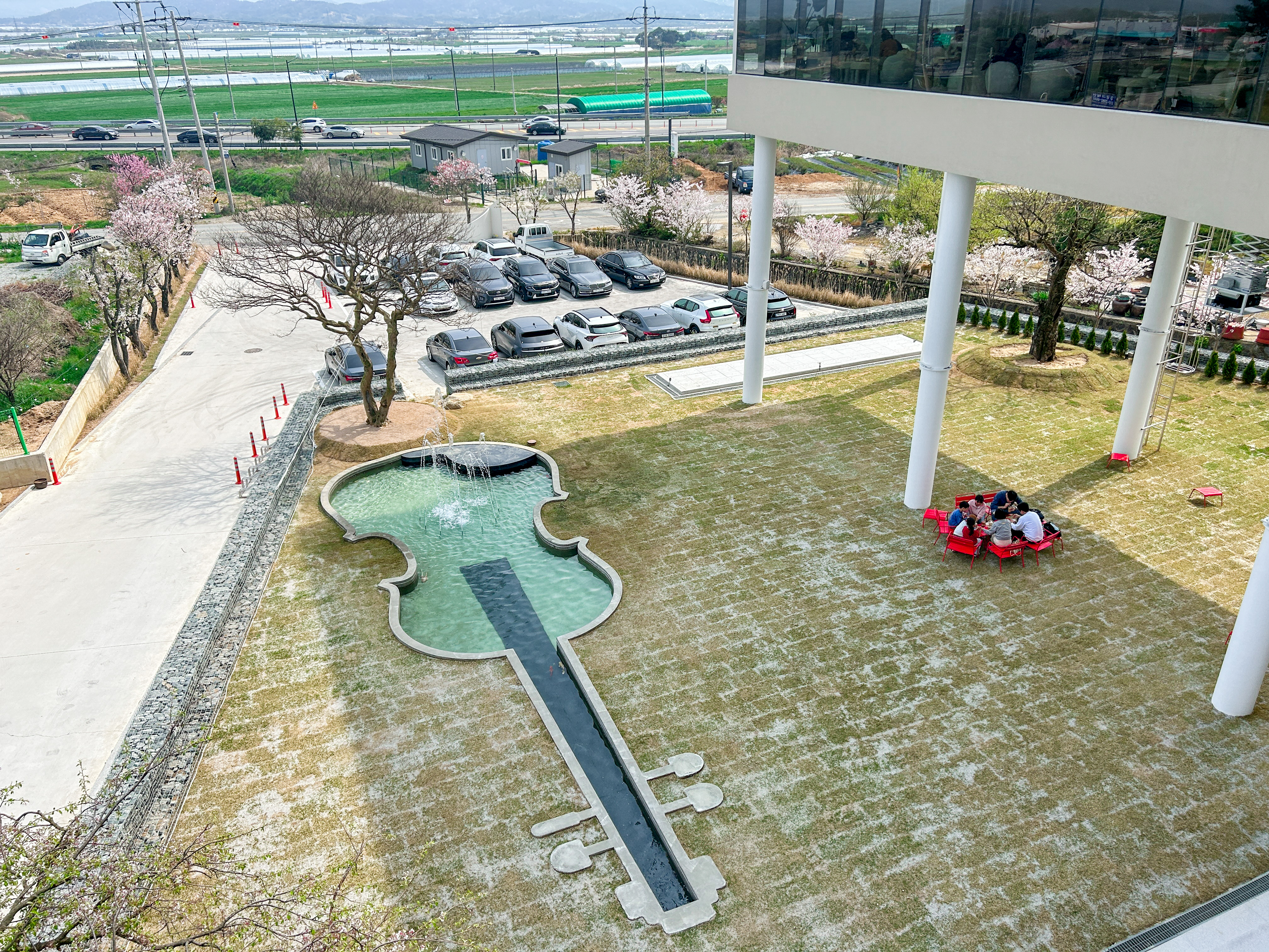 1층에는 넓은 마당같은 공간이 있고, 기타 모양을 한 연못에는 금붕어들이 거주 중이다. 다만 1층에 보이는 테이블은 옆에 빨간색으로 보이는 것이 전부이니, 앉아서 아이들이 뛰노는 것을 보기에는 생각보다 어려울 수 있다.