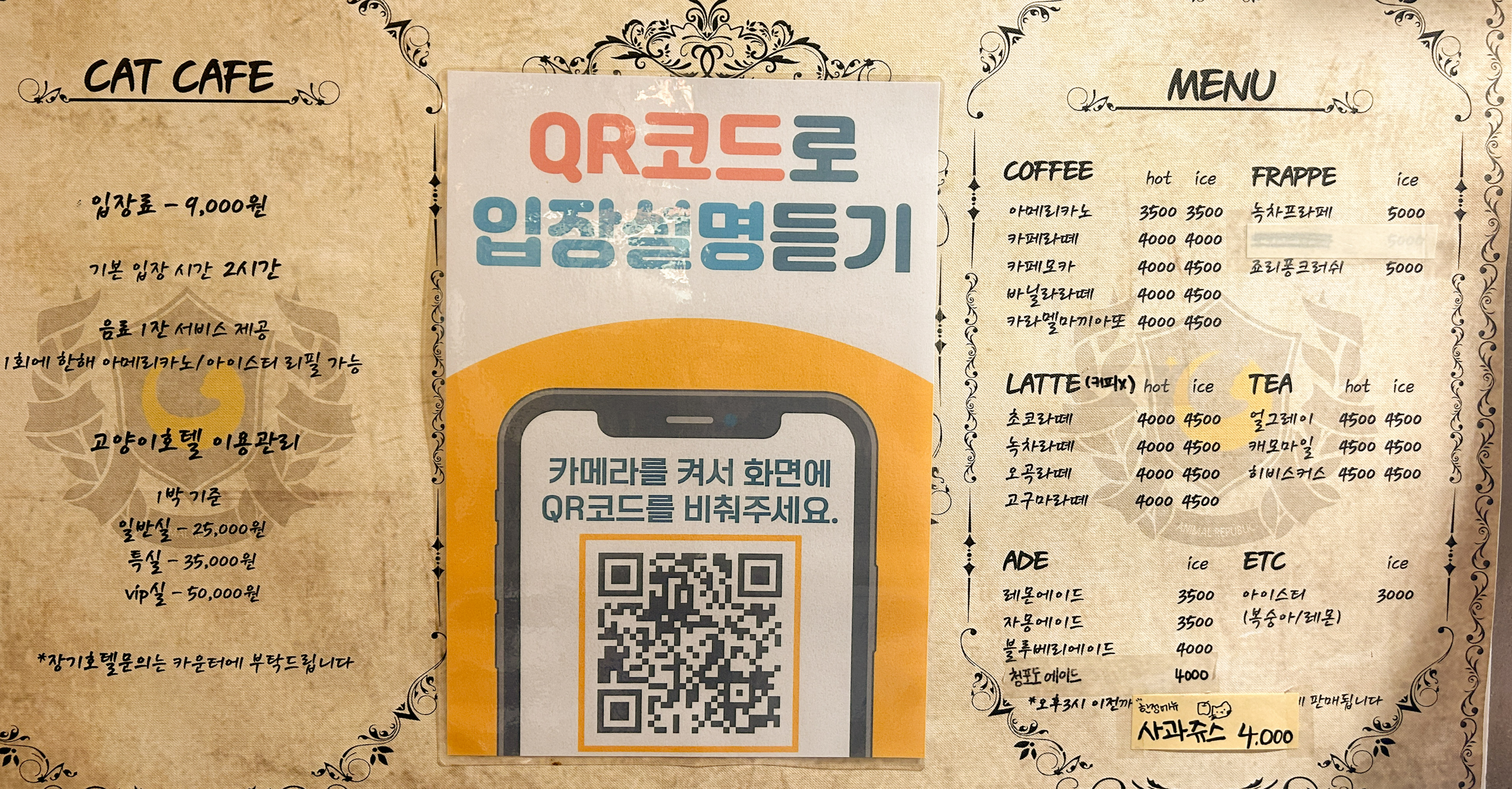 처음 오는 사람들은 가운데 QR코드를 통해 고양이들을 어떻게 다루어야 하는지에 대한 기본 교육을 듣고 나서, 영험한 고양이실로 입장이 가능하다. 영상의 퀄리티도 제법 좋아서 어린아이들도 쉽게 이해가 가능하다. 커피 주문 받고 하는 서비스는 생각보다 어리숙해보였는데도, 이 영상 안보고 들어가는 사람들에게는 아주 확고히 "밖에서 영상을 다 보시고 들어오셔야 합니다."라고 말하는 것을 보면, 고양이에게는 얼마나 진심인가를 알 수 있다.