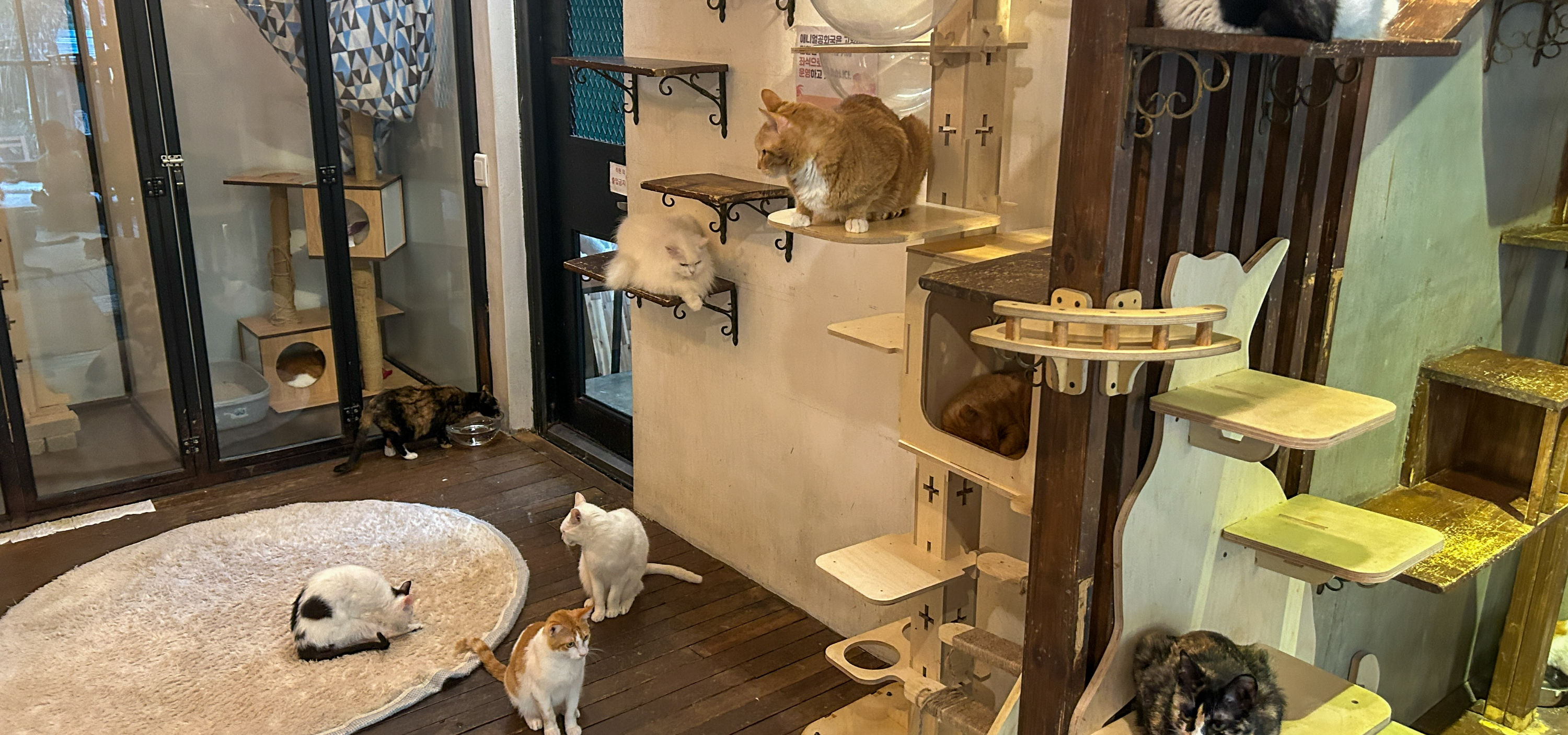 카페 공간과 고양이들이 있는 공간은 유리 통창으로 명확하게 구분되어 있다. 우리 가족은 오픈 하자마자 들어가서인지 우리 세가족만이 고양이를 바라 보고 있는데, 30마리의 고양이들이 전부 우리를 쳐다보니 우리가 고양이를 관람하는 것인지, 고양이가 사람을 관람하는 것인지 구분하기 어려운 모양새이다.